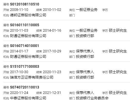 同为硕士学历的蔡超,可能是任职“资历”较浅,目前尚未获得保代资质。他自2015年8月起任职于财通证券投资银行部;2017年11月至2018年3月任职于国开证券投资银行部,2018年3月起任职于瑞信方正固定收益部。协会信息显示,蔡超已于2020年7月离职,目前“去向不明”。