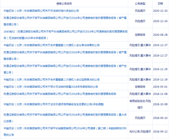 “16长城01”“16长城02”由邹平长城集团有限公司发行,规模均为6亿元,到期日分别为2018年8月13日和2018年11月8日。2018年2月,公司更名为中融双创(北京)科技集团有限公司(简称:中融双创)。在公告栏中,财通证券同样以债券受托管理人的身份,披露破产重整等重大信息。一则更新于2020年12月的公告称,中融双创构成实质性违约。