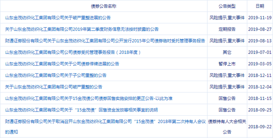 在“15金茂债”的公告栏,财通证券曾以债券受托管理人身份发布过多期公告。2018年11月,山东金茂更正发布“15金茂债”的回售公告。同年12月,发布《关于山东金茂纺织化工集团有限公司破产重整的公告》。