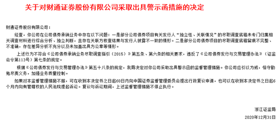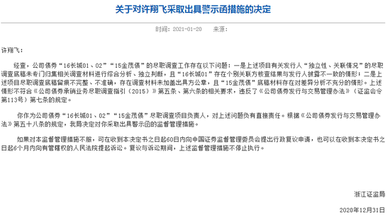 浙江证监局表示,三位当事人均不符合《公司债券承销业务尽职调查指引(2015)》第五条、第六条的相关要求,违反了《公司债券发行与交易管理办法》(证监会令第113号)第七条的规定。根据《公司债券发行与交易管理办法》第五十八条的规定,分别对其采取出具警示函的监管措施。
