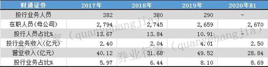 2017-2019年,财通证券母公司人员净减少135名,其中投行业务人员减少92名;投行人员占比从2017年的13.67%降至2019年的10.91%。