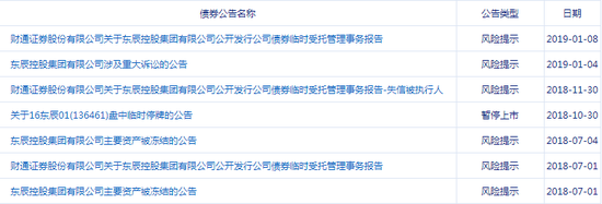 日期较新的几则公告显示,债券受托管理人财通证券在2018年11月发布临时受托管理事务报告,披露东辰控股被列入失信被执行人。在2019年1月之后,再无新的公告。