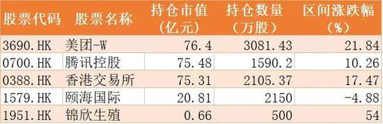 以易方达蓝筹精选的操作为例,张坤持有美团2619.23万股、持仓市值64.94亿元,相比三季度末增持了208.14%;持有腾讯控股1352万股、持仓市值64.18亿元,相比三季度末增持了88.20%;持有香港交易所1779.67万股、持仓市值63.66亿元,相比三季度末增持了75.81%,都是大手笔增持。去年四季度,这三只个股的涨幅分别为21.84%、10.26%和17.47%,目前其仍位列张坤港股持股的前三位。