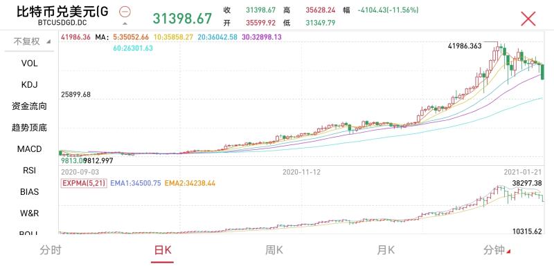 北京时间1月21日晚,比特币价格突然暴跌。市场数据显示,比特币日内一度下跌超过4000美元至31000美元/枚下方,跌幅达12.5%。