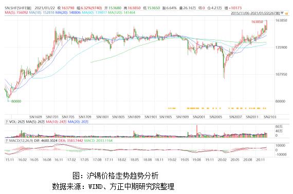 2021年初,随着美元反弹乏力,新一轮财政刺激措施提振经济复苏预期,叠加锡市供不应求的整体格局,沪锡03合约和04合约均突破16万整数关口,最高达到16.385万元,继续刷新历史新高;伦锡方面,伦锡价格突破2.2万的第一阻力位,最高达到2.24万美元,若能有效突破后将会上探2.4万元的前高位置,对于沪锡而言,则可能会涨至17万上方。