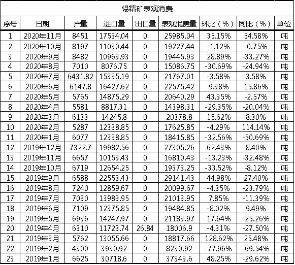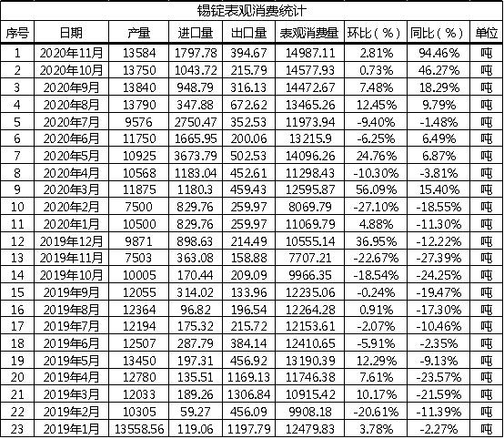 锡精矿表观消费方面,9月以来,进口量恢复正常水平,表观消费量亦处于正常区间。总体来看,2020年国内锡精矿产量变化不大,疫情影响相对有限,锡精矿的进口量是锡精矿表观消费量的核心影响因素;并且表观消费量的表现亦有利于锡价的涨势。随着传统淡季的来临,精炼锡表观消费量在12月会小幅走弱,在1月份则会大幅增加(主要是春节前的备货主导),在2-3月份有所减弱,3月份之后则回归正常的运行空间。