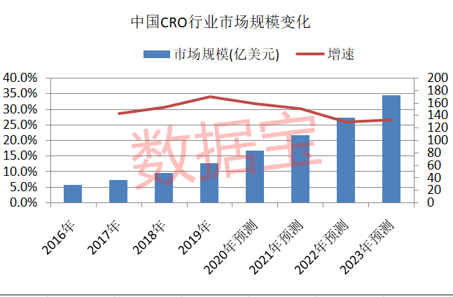 从整体市场来看,全球CRO市场从2014年的401亿元增长至2019年的626亿美元,年复合增速为9.3%。中国CRO市场增长最为显著,复合增速排名全球最快。从2016年的28亿美元增长至2019年的63亿美元,年复合增速为28.5%,保持高速增长,预计2020年国内CRO规模将达到83亿美元,复合增速超20%,到2023年中国的CRO市场规模将会达到172亿美元,占全球规模的约20%。