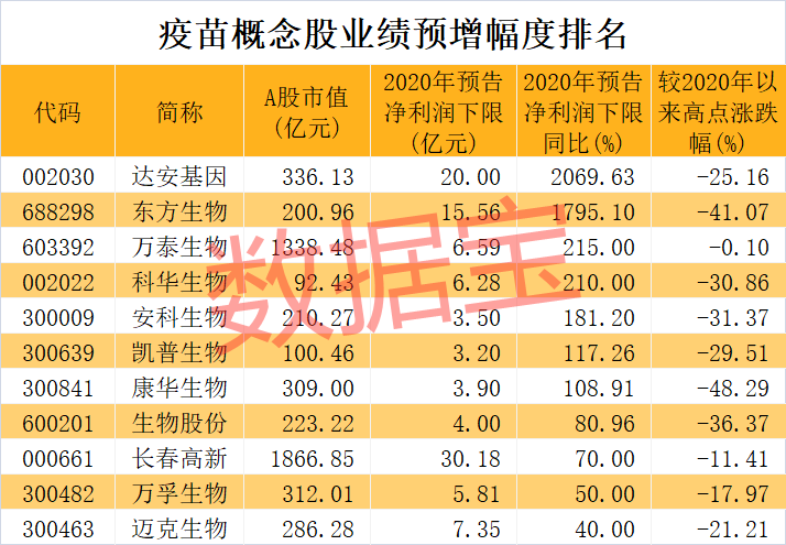 证券时报·数据宝统计显示,目前已有11只疫苗概念股公布业绩预告,且2020年净利润预增40%以上。净利润预增幅度最大的是达安基因,公司预计净利润为20亿元至22亿元,同比增长20倍以上。这11股中,康华生物、东方生物、生物股份、安科生物、科华生物等5股较2020年以来高点回撤30%以上。