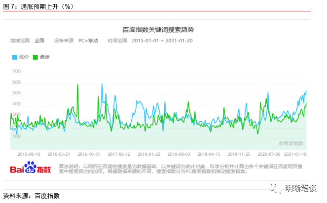 通胀不必过度担忧,预计PPI同比增速不会太夸张,看价格环比更有意义。去年年底以来,以能源、黑色为代表的大宗工业品价格上涨较快,部分投资者对于今年的PPI通胀有所担忧,从百度指数关键词搜索趋势中也可见一斑,但我们认为通胀对债市的影响相对有限。根据我们的估算,今年二季度PPI同比增速的高点可能在3.5%左右,均值难超3%,主要是低基数因素和部分商品目前较高的价格导致的。对于通胀而言,环比的意义要大于同比,如果从环比的角度看,今年工业品的涨价空间相对有限。