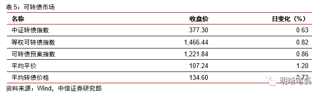 1月21日转债市场,中证转债指数收于377.30点,日上涨0.63%,等权可转债指数收于1,466.44点,日上涨0.82%,可转债预案指数收于1,221.84点,日上涨0.86%;平均平价为107.24元,日上涨1.20%,平均转债价格为134.60元,日上涨0.73%。339支上市交易可转债(辉丰转债除外),除华菱转2、冀东转债、贝斯转债、宁建转债、大族转债、智能转债和久其转债横盘外,194支上涨,138支下跌。其中明阳转债(11.12%)、安20转债(9.63%)和蓝帆转债(8.78%)领涨,翔港转债(-5.61%)、蓝晓转债(-3.02%)和晶瑞转债(-2.92%)领跌。333支可转债正股(*ST辉丰除外),除宁波建工、鲁泰A、宏辉果蔬、江苏银行、长城科技、盛路通信、众信旅游、吉林敖东、吉视传媒和海澜之家横盘外,212支上涨,111支下跌。其中亚太药业(10.10%)、翔港科技(10.06%)和蓝帆医疗(10.01%)领涨,东方时尚(-10.01%)、杭电股份(-5.38%)和晶瑞股份(-3.59%)领跌。