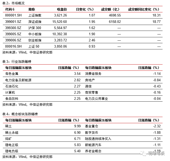 2021年1月21日,银存间质押式回购加权利率大体上行,隔夜、7天、1个月和3个月分别变动了9.70bps、-15.11bps、1.38bp、24.94bps和8.94bps至2.59%、2.40%、2.81%和2.77%。国债到期收益率全面下行,1年、3年、5年、10年分别变动-2.25bps、-4.14bps、-3.40bp、-2.75bps至2.45%、2.76%、2.92%、3.13%。上证综指上涨1.07%至3621.26,深证成指上涨1.95%至15520.60,创业板指上涨2.46%至3283.72。