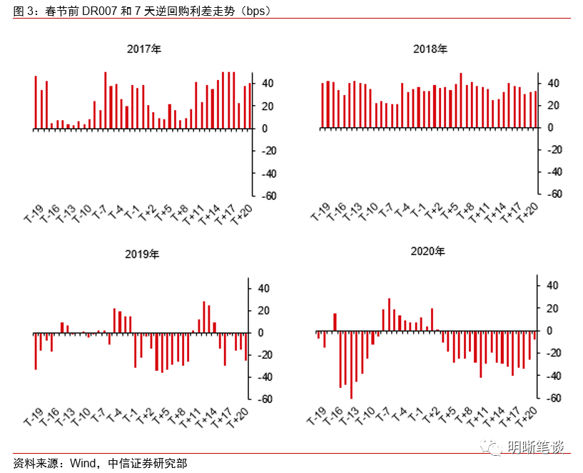 回顾过去几年春节前后的收益率曲线,可以总结出以下两个特征:(1)资金面自春节前15个交易日开始转松。(2)春节前长短端利率在大多数年份下行,短端往往下行更多,曲线变陡。