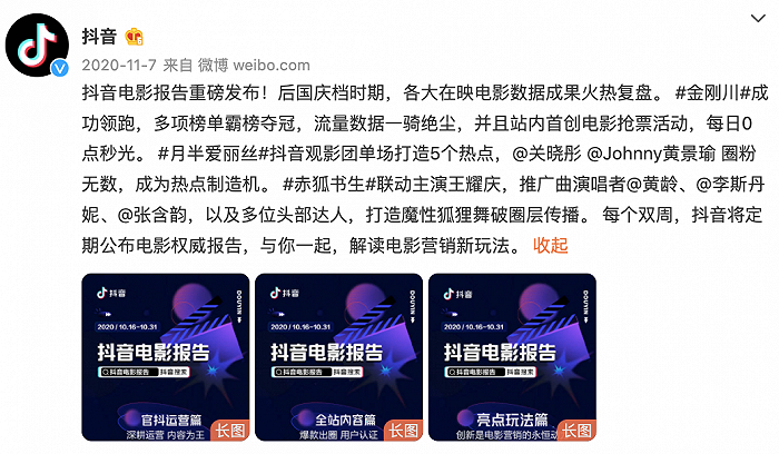 在DOULive厂牌建立之初,因疫情导致院转网的影片《大赢家》进行了为期三天的“云路演”,直播累计观看人数超过425万,主创连麦媒体大V,打下影片口碑传播基础。此外抖音还推出了#抖音双周电影报告#,通过整合数据,面向从业者提供参考。