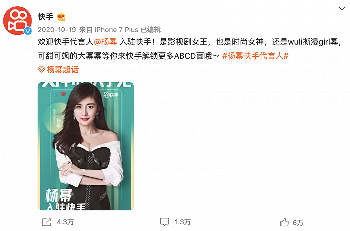 签下以杨幂、迪丽热巴等具备高商业价值的头部明星,可以为快手吸引更多的高消费力的城市用户,让快手有机会开展更多“大动作”。