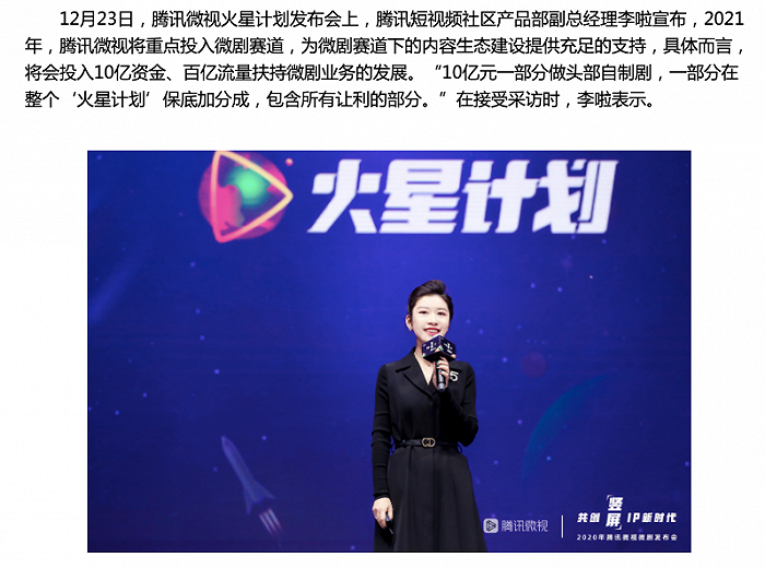 先是在去年春节期间,微视借助春节红包打入微信,还得到了马化腾的亲自背书,在疫情早期用户宅家高峰拉了一波新,到了年末又宣布投入10亿资金、百亿流量扶持微剧业务。