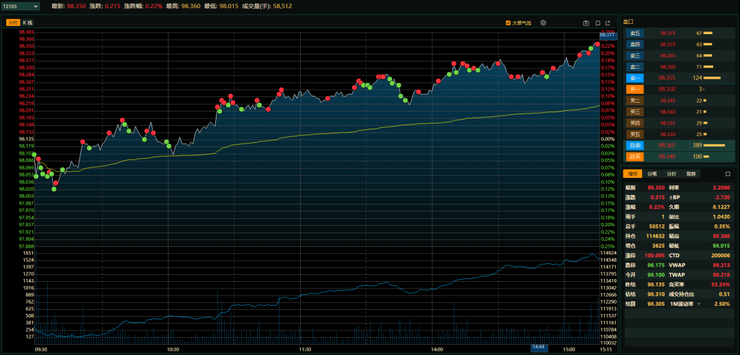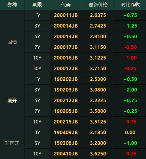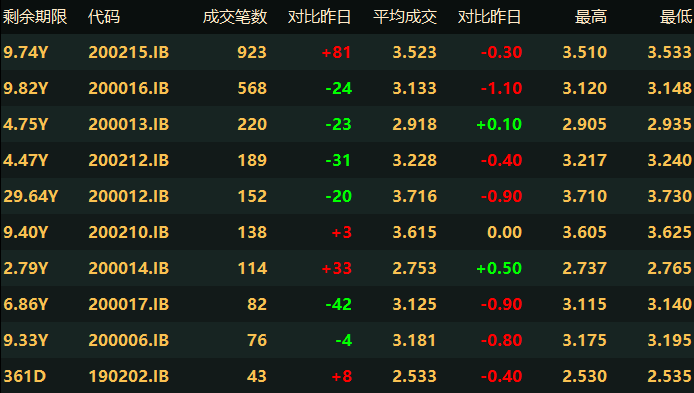 国债期货全线上涨。十年期主力合约涨0.215%;五年期主力合约涨0.08%;二年期主力合约涨0.005%。沪指震荡收跌,收于3606.75,跌0.40%。剩余期限9.74Y 20国开15 收益率震荡下行,最高成交在3.5325%,最低成交在3.51%,实时行情3.5125%,较昨收下行0.75BP。今日成交923笔(昨日成交842笔)。