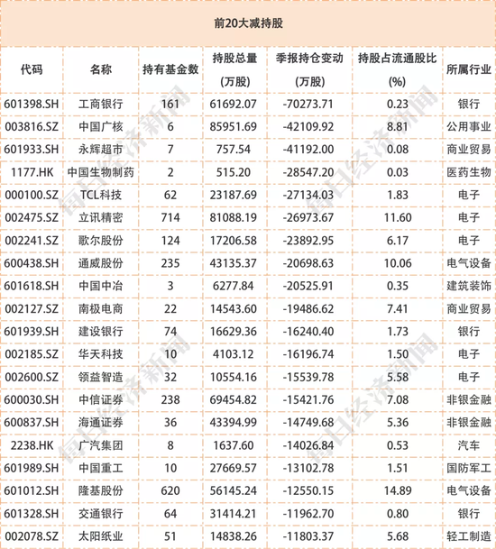 此外,基金对于TCL科技、立讯精密、歌尔股份、通威股份、广汽集团等热门股的减持均超过1亿股。