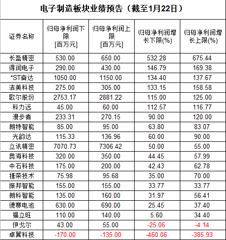 电子制造板块的业绩也非常喜人。其中,增幅最大的是长盈精密,超过5倍;得润电子、*ST奋达、洁美科技、歌尔股份、科力远等公司业绩增幅也超过1倍。