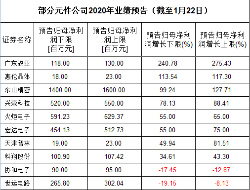 广东骏亚、惠伦晶体业绩增幅居前。广东骏亚预计2020年盈利1.18亿元至1.3亿元,同比增长240.78%至275.43%。