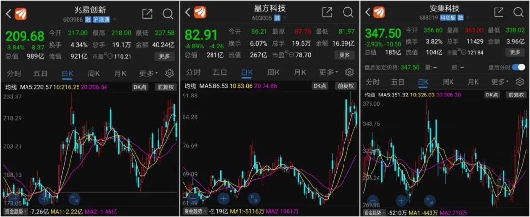 1月22日,晶方科技股价下跌4.89%,每股报收82.91元,总市值为281亿元,今年以来股价涨幅为28.82%;兆易创新股价下跌3.84%,每股报收209.68元,总市值为989亿元,今年以来股价涨幅为6.17%;安集科技股价下跌2.93%,每股报收347.5元,总市值为185亿元,今年以来股价涨幅为16.69%。