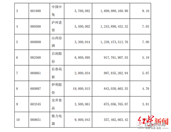 汇添富消费行业混合前十大重仓股:贵州茅台、五粮液、中国中免、泸州老窖、山西汾酒、百润股份、长春高新、伊利股份、安井食品和格力电器。