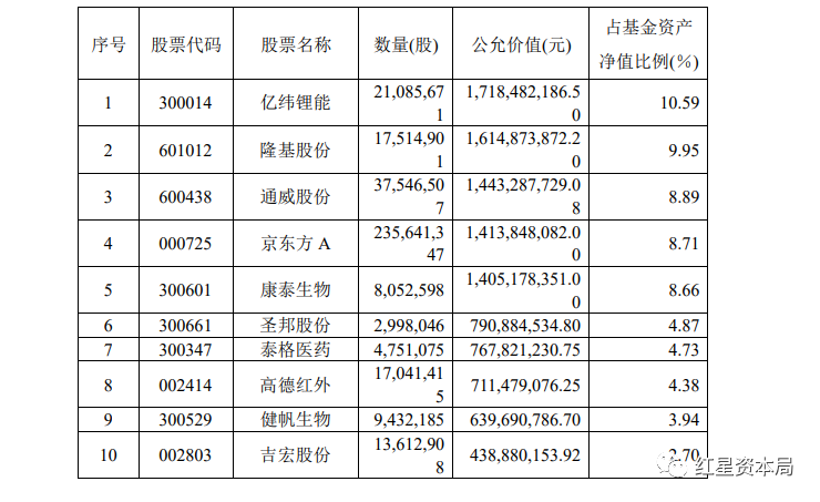 广发小盘前十大重仓股分别为:亿纬锂能、隆基股份、通威股份、京东方A、康泰生物、圣邦股份、泰格医药、高德红外、健帆生物和吉宏股份。