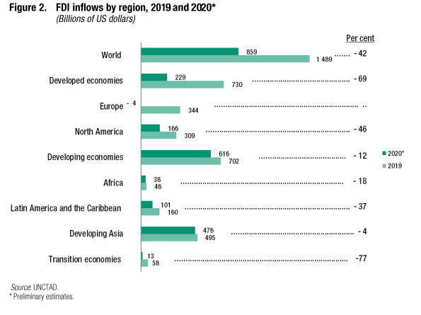 UNCTAD在报告中表示,FDI降幅集中在发达国家。2020年流入发达国家的FDI同比下降69%至2290亿美元,是过去25年的最低水平,与之相比流入发展中经济体的FDI下降了12%至6160亿美元。