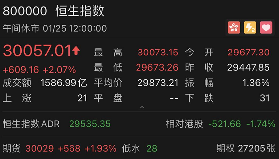 1月25日早盘,恒生指数高开高走,重回三万关口。