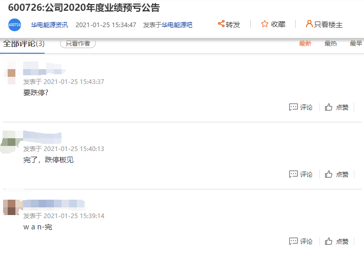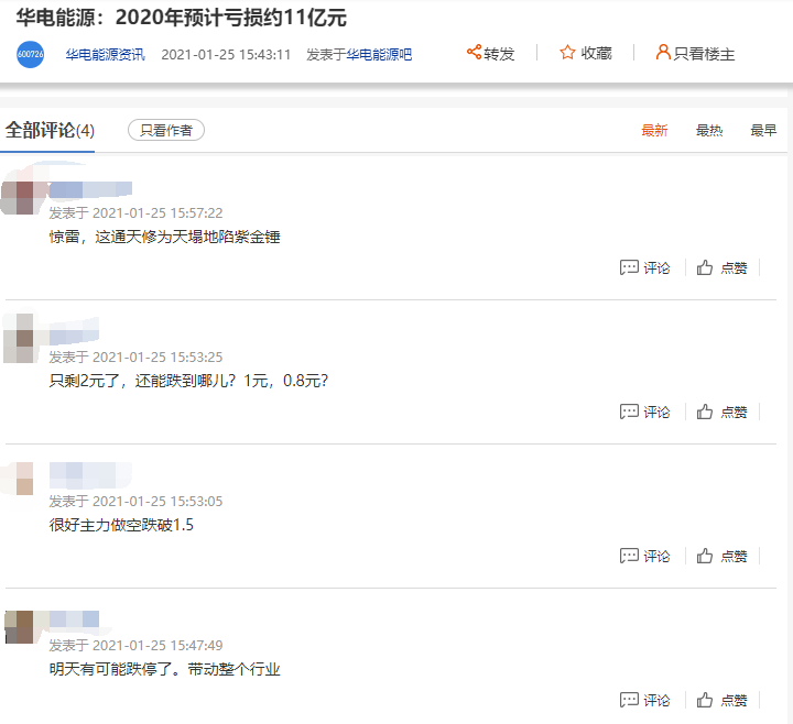 对于华电能源业绩预亏,股吧网友反应热烈,有网友表示,“完了,跌停板见”,也有网友表示,“只剩2元了,还能跌到哪儿?”