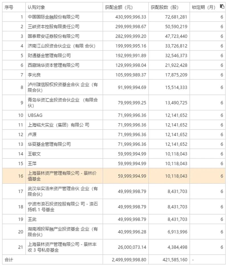 近日,京运通发布公告称,公司发行价格为 5.93 元/股,发行股票数量为421,585,160股,其中景林资产旗下两只产品参与定增,获配超1400万股。