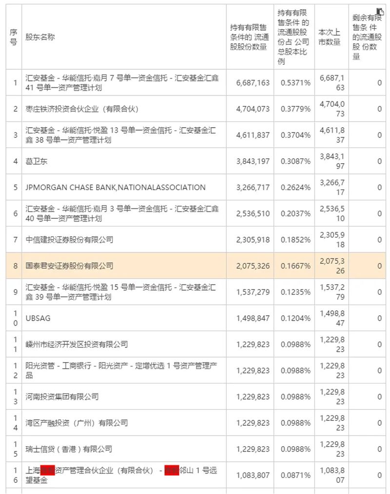 值得注意的是,这批解禁的股东共16位,其中就包括高毅资产知名基金经理冯柳和私募大佬葛卫东,高毅资产冯柳管理的邻山1号远望基金去年获配108.4万股,成本约为1.4亿元,葛卫东则获配384.32万股,成本约为5亿元。按照130.1元/股的获配价格来算,截至今日收盘,其跌幅超过10%。