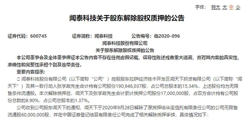 之后9月,闻泰科技又发布公告称,公司股东闻天下于2020年9月28日将质押的公司股份6000万股解除质押。闻泰科技股份有限公司控股股东拉萨经济技术开发区闻天下投资有限公司及其一致行动人张学政先生合计持有公司股份约1.91亿股,占公司总股本的15.34%,上述股份均为无限售条件流通股。本次解除质押后,闻天下及张学政先生合计累计质押公司股份1700万股,占双方合计持有公司股份总数的8.90%,占公司总股本的1.37%。