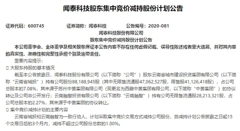公开资料显示,闻泰科技于2020年8月7日披露了《股东集中竞价减持股份计划公告》。截至公告披露日,云南省城投和云南融智通过集中竞价方式累计减持公司股份299.99万股,占公司目前总股本的0.24%。