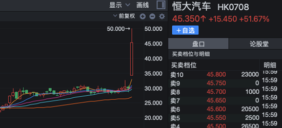 次日,恒大汽车收盘价为每股45.35港元,涨幅达51.67%,盘中涨幅一度突破60%。市值从上个交易日的约2800亿港元飙升至当日收盘时的3998亿港元。这对于恒大汽车的投资者来说,自然是喜不自胜。