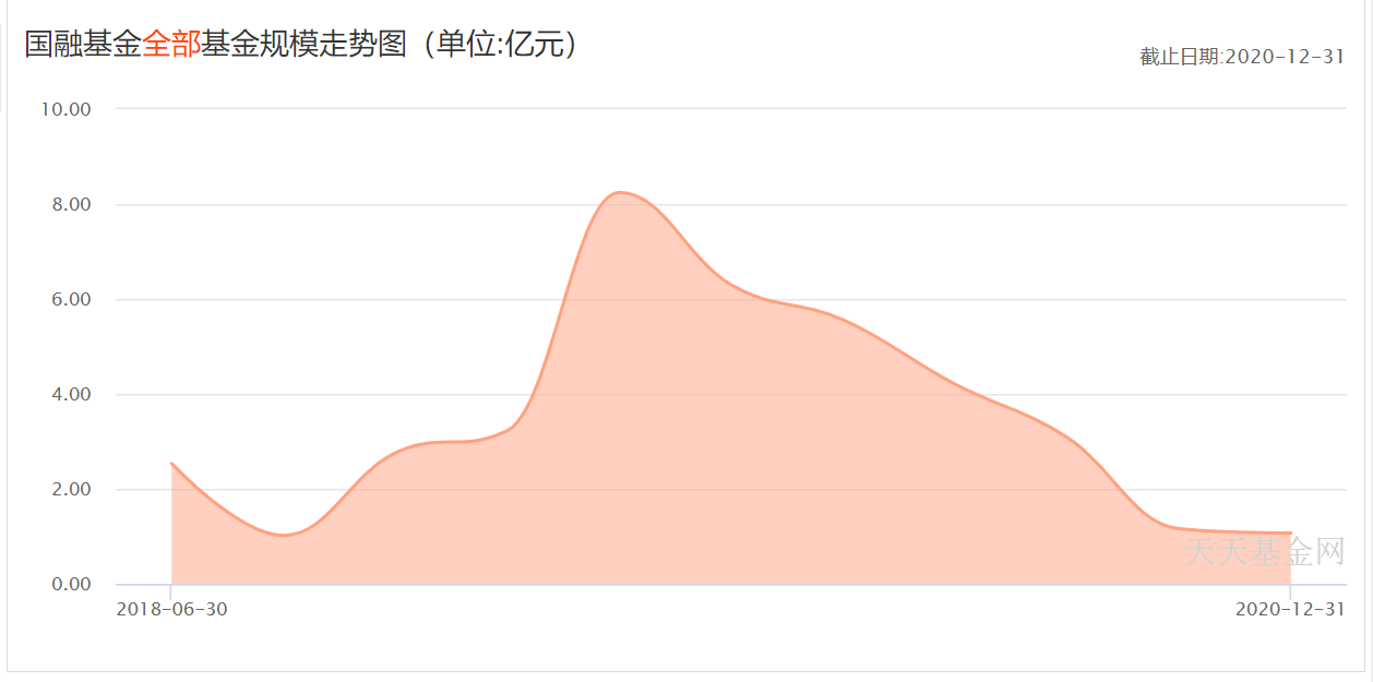 据同花顺iFinD数据,截至2020年年底,国融基金公募管理规模仅有1.07亿元,较年初缩水86.85%,在143家持牌机构中,排名倒数第四位;且公司旗下6只基金皆为“迷你基金”,规模最大的一只资产净值不过0.43亿元,最小的一只仅有340万元。具体来看,国融基金旗下共有6只混合型基金,截至去年年度总份额为0.71亿份,与年初的7.71亿份相比下降了90.78%。
