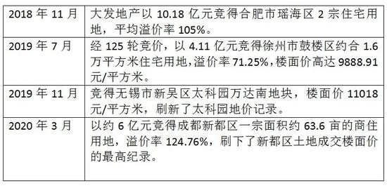 激进拿地的背后伴随着不惜重金的土储成本。2020年中期大发地产新增土储平均成本为5974元/㎡,较2019年5349/㎡增长近10.46%,以下为近年来大发地产拿地案例(不完全统计):
