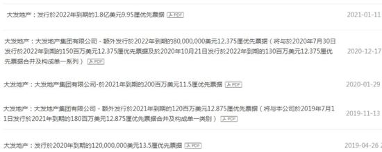 大发又发债了。2021年1月11日大发地产公布发行2022年1月18日到期、利率为9.95%的1.8亿美元债,并于1月20日正式生效。据统计,自上市以来,大发已累计发债约11.6亿美元,除了最近这一次,票面利率均在11.5%到13.5%之间,远高于行业平均水准。