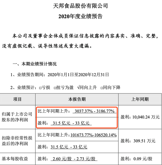另一龙头天邦股份的业绩增速更是气势如虹。公告显示,公司预计2020年净利润为31.5亿元~33亿元,同比增长3037.37%~3186.77%;预计扣非净利润为31.5亿元~33亿元,同比增长101673.77%~106520.14%,即增幅超过1000倍。