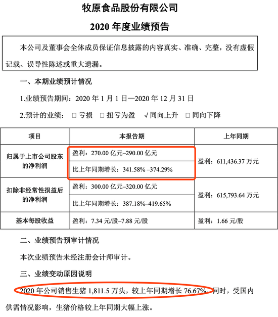 据公告,有“猪中茅台”之称的牧原股份预计2020年盈利270亿元~290亿元,同比增加341.58%~374.29%,扣非净利润预计达300亿元~320亿元。
