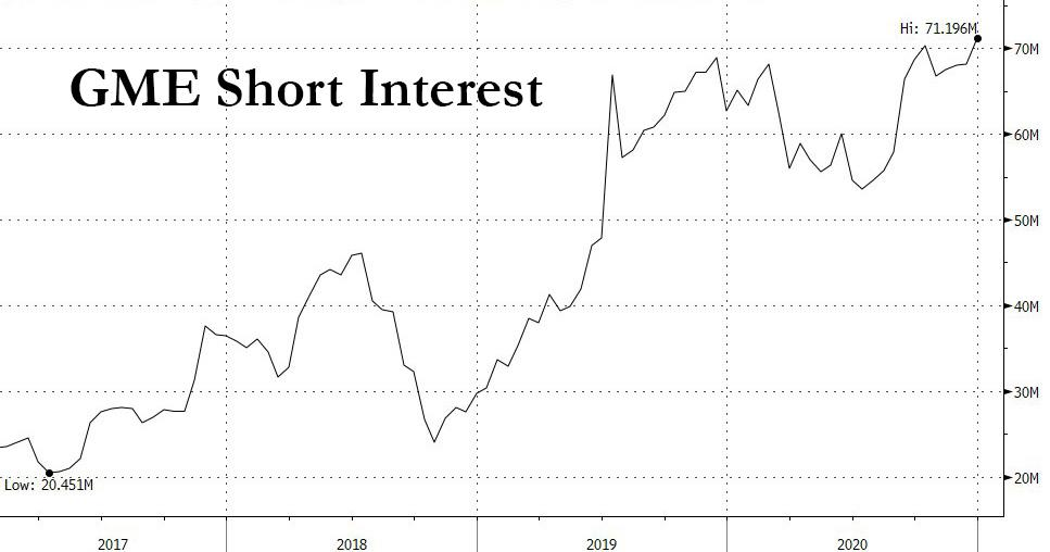 Game Stop是一只濒临退市的股票,其股价从2016年的28美元一路跌到2019年底的3美元。据说Game Stop是去年被做空得最多的股票。FactSet的数据显示,该股票的空头净额占股票流通量的比例最高时超过140%。