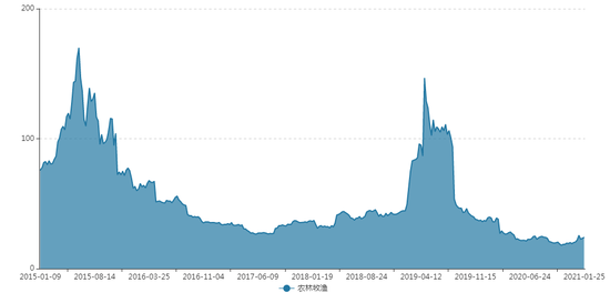 事实上,经过了2019年养猪板块的集中大爆发,畜牧养殖板块长期归于沉寂。当前来看,畜牧养殖板块估值整体处在较低水平。据Wind统计显示,截至1月25日,农林牧渔板块整体市盈率仅为24.05倍,处在近五年最低位水平。而这相较于2019年4月超过140倍的高位估值降幅超过80%。(见图2)