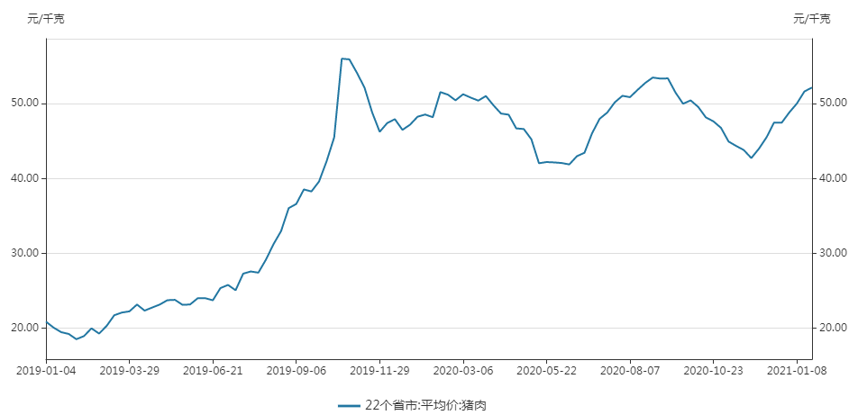 据初步测算,2019年22个省市猪肉平均价约为31元/千克,2020年则升至约48元/千克。