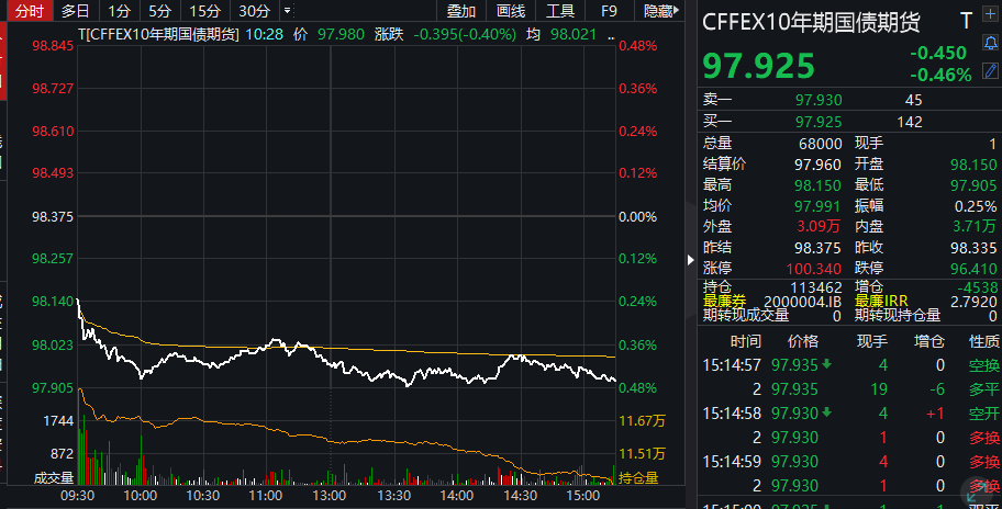 26日,国债期货午盘全线下跌,10年期主力合约跌0.41%,5年期主力合约跌0.28%,2年期主力合约跌0.15%。而银行间主要利率债收益率大幅上行,短券上行幅度更大。10年期国债活跃券200016收益率上行3.12bp,5年期国债活跃券200013收益率上行5.25bp,2年期国债活跃券200011收益率上行5.75bp。10年期国债活跃券200016最新成交在3.16%,上日尾盘为3.1350%;10年期国开债200215最新成交在3.5550%,上日尾盘报在3.5325%。