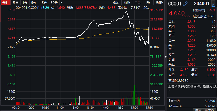 与此同时,交易所市场的交易品种也出现波动,国债逆回购品种GC001大幅上行,盘中冲高回落,最终收于4.64%,较上一交易日上行166.5个基点。