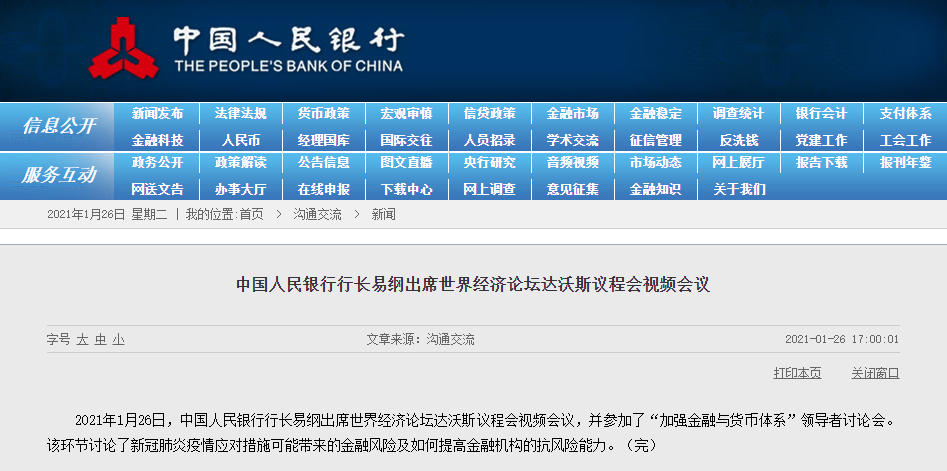然而有意思的是,北京时间1月26日下午,中国人民银行行长易纲在出席世界经济论坛达沃斯议程会视频会议时,明确强调“我们将确保政策的连续性和稳定性,并且不会过早退出支持政策。”