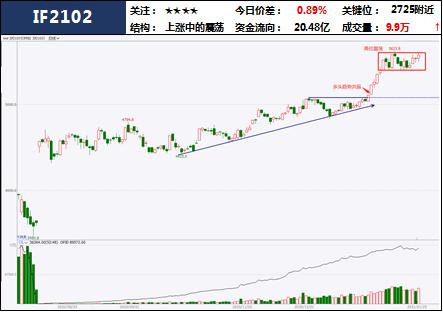 2020年第四季度GDP增速超过预期,中国经济从疫情恢复的速度非常可观,GDP历史性突破100万亿元,市场情绪转暖。同时2020年在多数国家外资流入下降的情况下,中国吸引外资逆势增长,成为全球最大外资流入国。但是进入冬季以来,新冠疫情在多地又出现死灰复燃的态势,在上方形成较大阻力。近日IF触发多头信号后目前高位震荡,今日虽走强上探但小周期仍在区间内。后市新仓需等待走出区间。