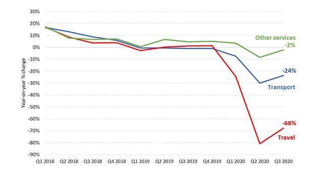 其中,旅游行业仍是受影响最严重的服务贸易领域,2020年第三季度,全球旅行同比下降68%,不过计算机服务行业却逆势增长9%。