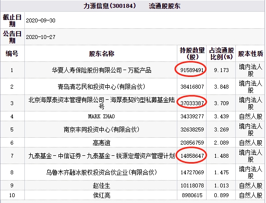 截止2020年9月30日,华夏人寿保险股份有限公司-万能产品为力源信息的第一大流通股股东,其持股数量为9158.95万股,占流通股比例为9.173%;北京海厚泰资本管理有限公司-海厚泰契约型私募基金陆号为力源信息的第三大流通股股东,其持股数量为3703.34万股,占流通股比例为3.709%;九泰基金-中信证券-九泰基金-锐源定增资产管理计划为力源信息的第七大流通股股东,其持股数量为1485.86万股,占流通股比例为1.488%。