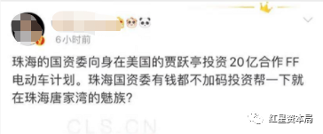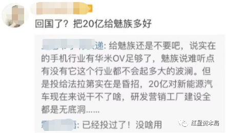 “回国了?把20亿给魅族多好”“珠海国资委如果有钱不如加码一下珠海唐家湾的魅族”……红星资本局注意到,今天珠海国资委投资FF的消息也引起诸多魅族粉丝的不满。