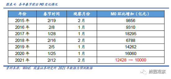 第一,春节前企业发年终奖、年终决算,居民消费等会增加现金需求,关注就地过年的扰动。2015-2020年春节前月份(月底过春节即算当月值,月初过春节算上月值)M0环比平均增加1.24万亿。具体到2021年,疫情之下部分春节返乡人员可能提前行动,对应取现需求也提前;同时,受就地过节等影响,居民节前消费可能下降,降低现金需求。综合看,我们在往年均值基础上下调2021年现金需求至1万亿左右。